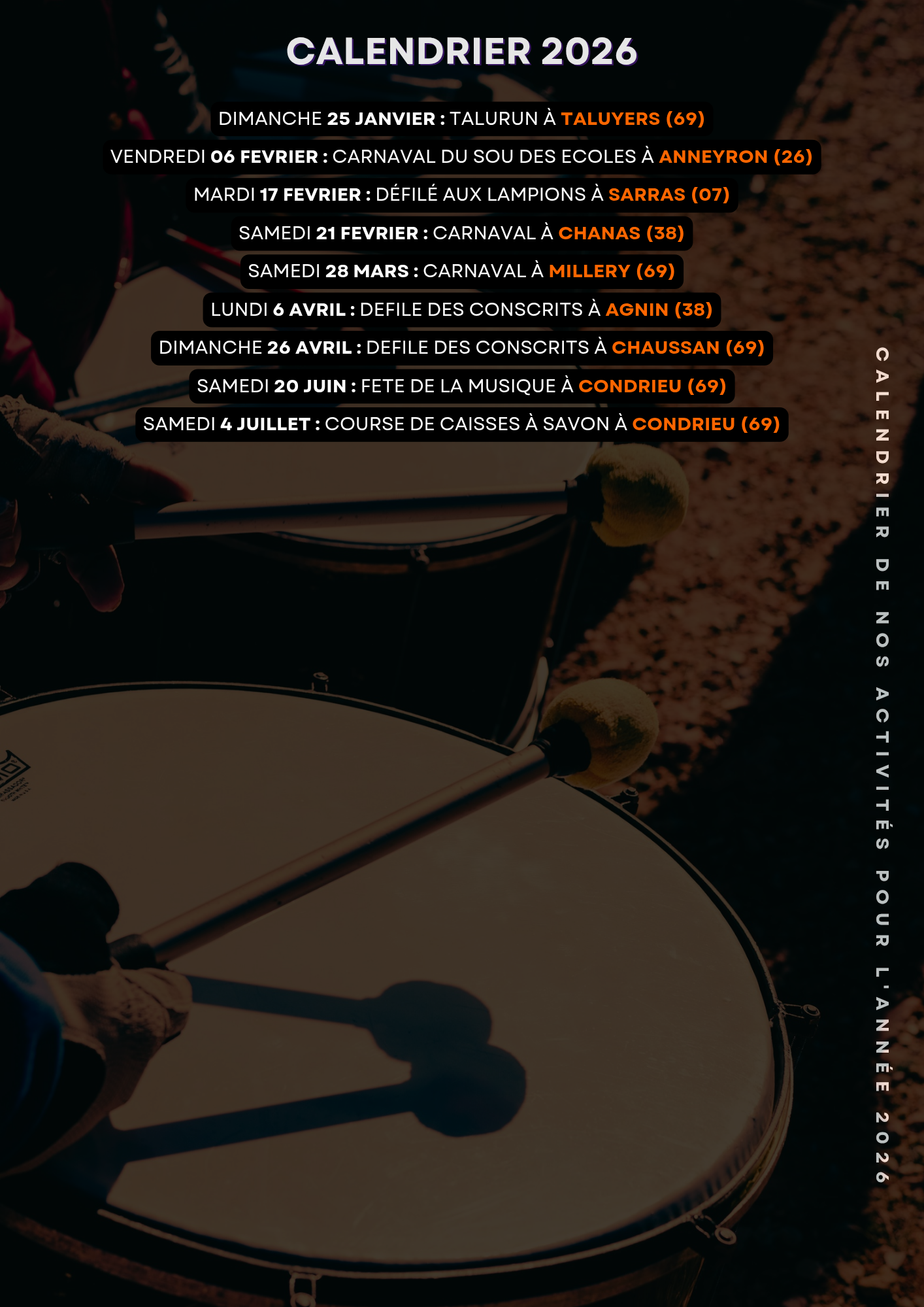 Découvrez l'énergie contagieuse de la batucada et participez à nos animations spéciales. Rejoignez-nous pour vivre des moments uniques !
